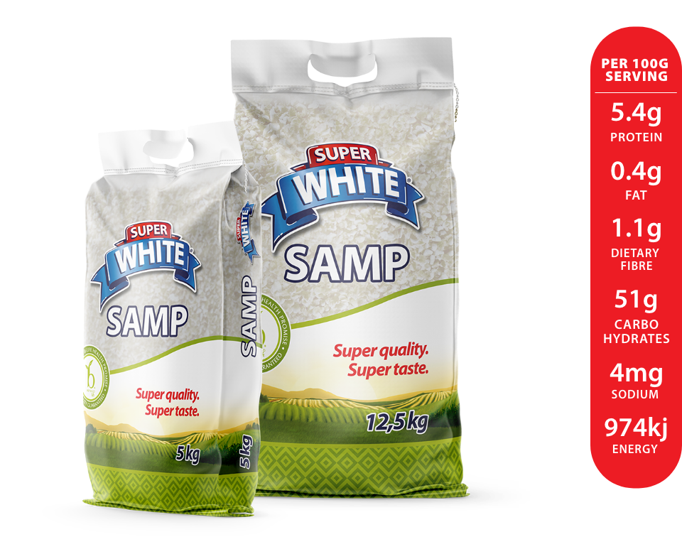 Our Samp is a new, energy-rich product with low fat content. Available in 2kg, 5kg, 10kg, and 12.5kg packs, it’s made from coarsely stamped South African maize. Commonly enjoyed with beans, it’s a hearty dish loved by many.